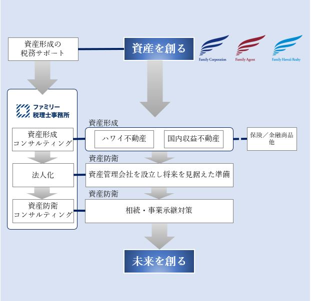 弁護士、司法書士、税理士とその道に精通している専門家集団であり、節税効果の高い不動産を活用したコンサルティング実績が豊富で、様々な事例に合わせて最適なご提案が、スピード感、最大化効果を実現に導いています。Create the Future